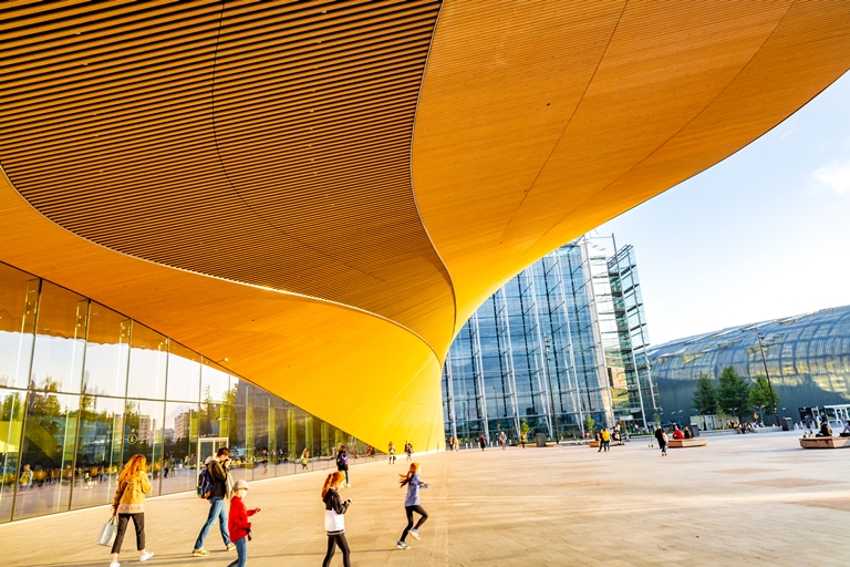 Oodi is a striking building with its glass and steel structures and wooden facade, its design a combination of traditional and contemporary flavours. The energy-efficient library is an impressive calling card for Finnish architecture.